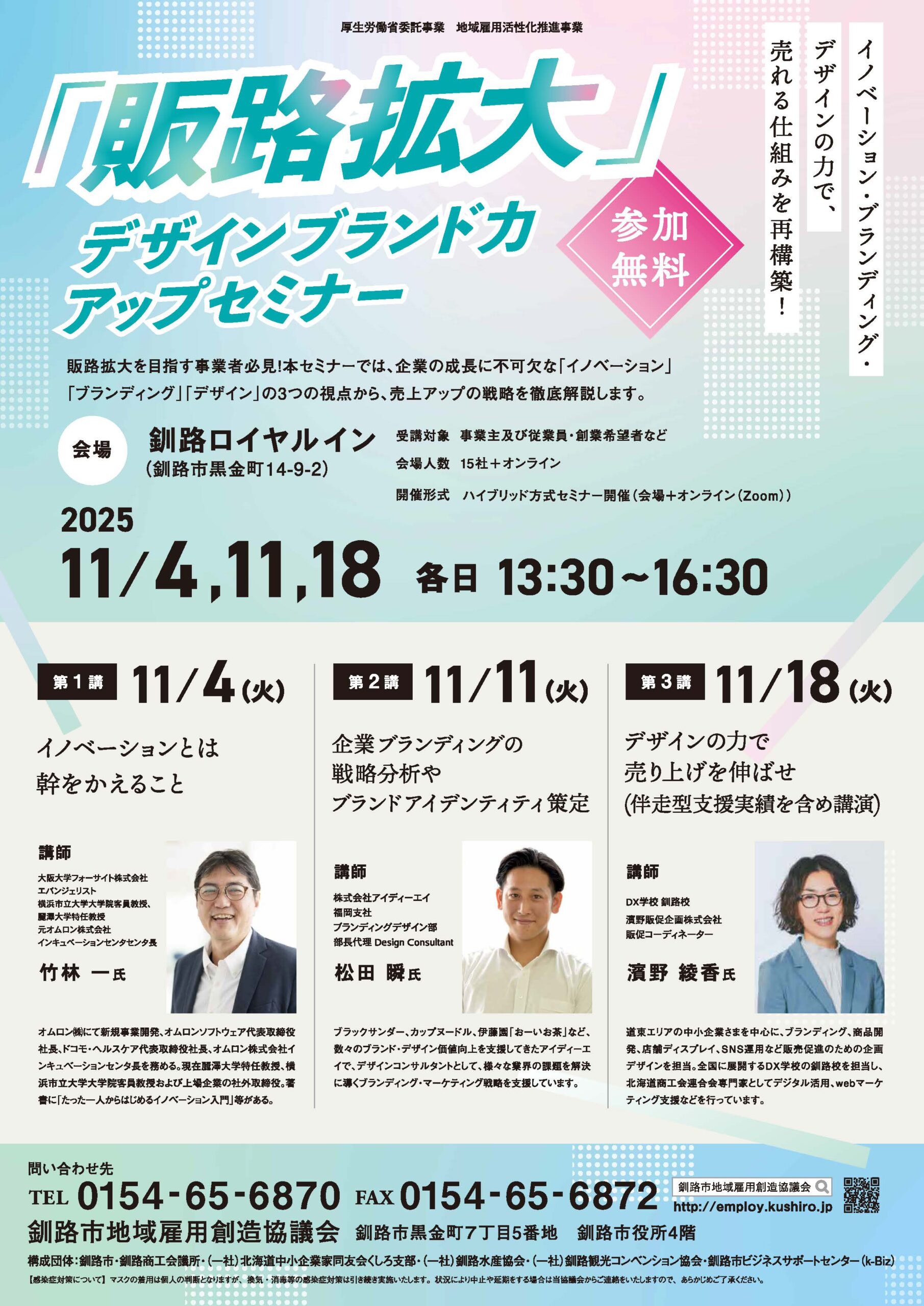 開催日 令和7年11月4日(火)・11日(火)・18日(火) 時間 13:30~16:30 対象 企業・事業主及び従業員・創業希望者など 参加方法 会場参加 または Zoom 会場 釧路ロイヤルイン(釧路市黒金町14-9-2 チラシPDF 「販路拡大」デザインブランド力アップセミナー - カテゴリー:企業向けセミナー