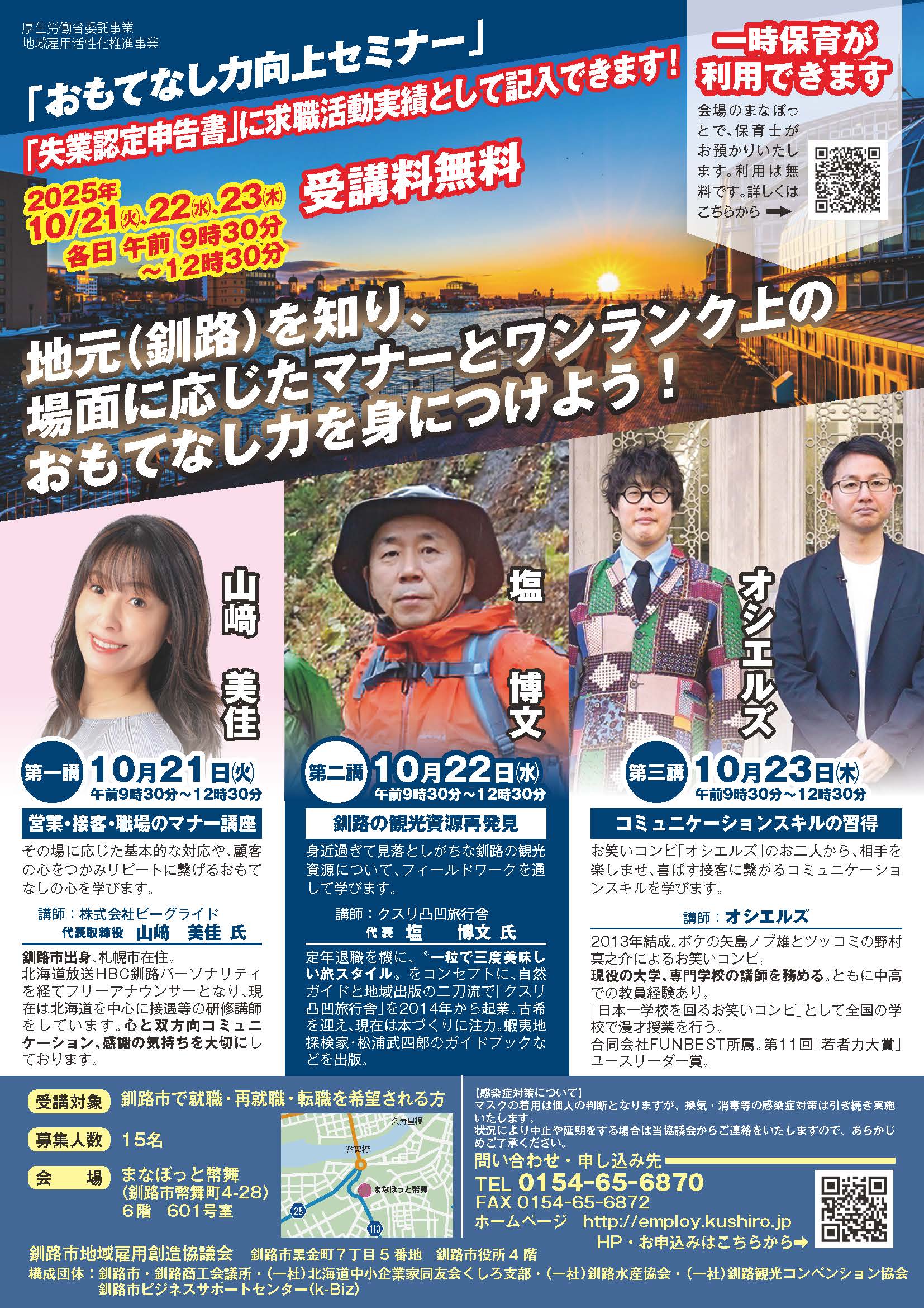 一時保育無料! 利用案内はこちら→ 一時保育について開催日 令和7年10月21日(火)・22日(水)・23日(木) 時間 9:30~12:30 対象 釧路市で就職を目指す求職者、転職、正社員転換希望者 定員 15名(定員になり次第締切) 会場 まなぼっと幣舞(釧路市幣舞町4-28) チラシPDF おもてなし力向上セミナー 受付は終了しました