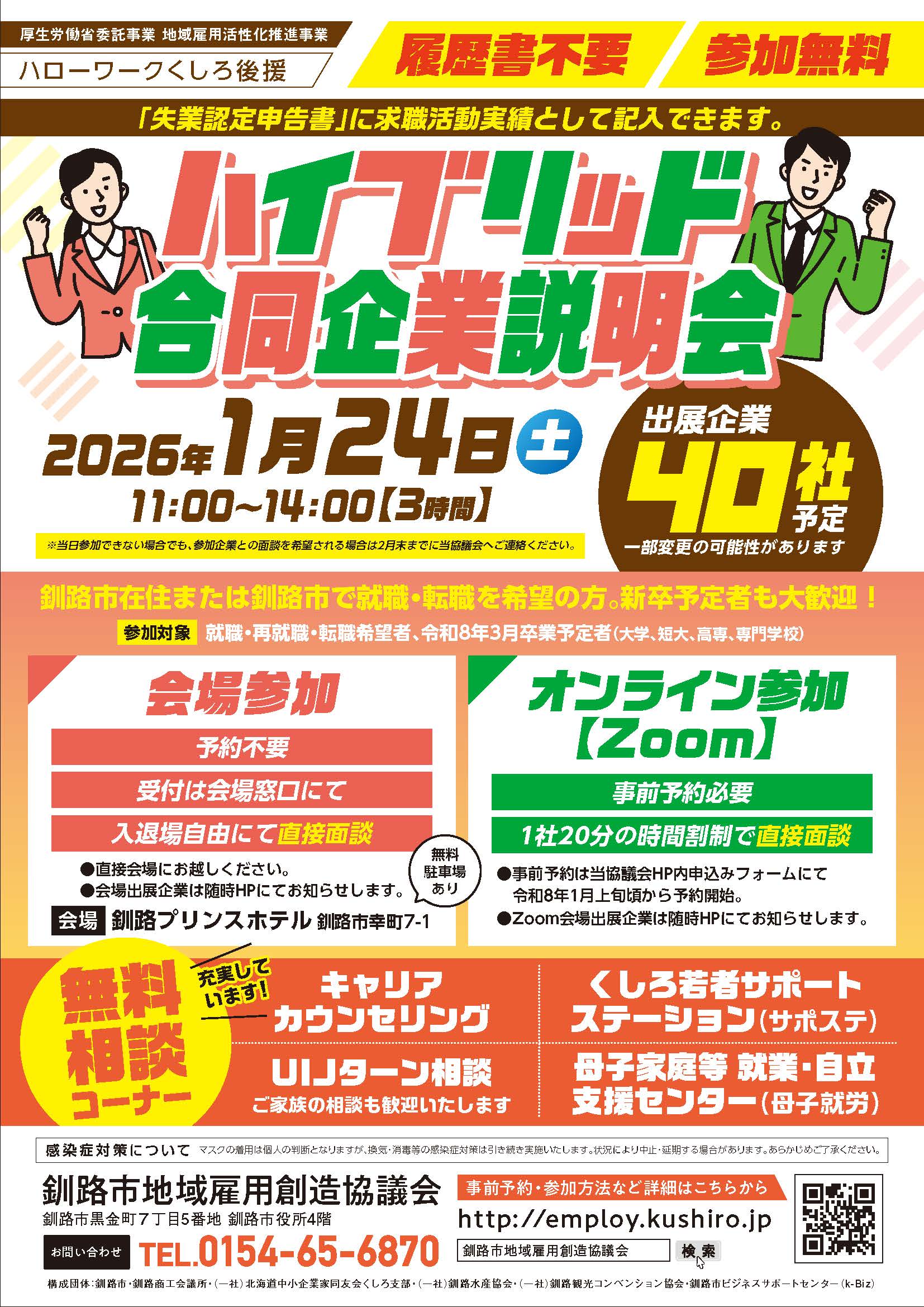 釧路市在住または釧路市で就職、転職をご希望の方にお知らせです。ハローワーク釧路の後援で、合同企業説明会を開催いたします。